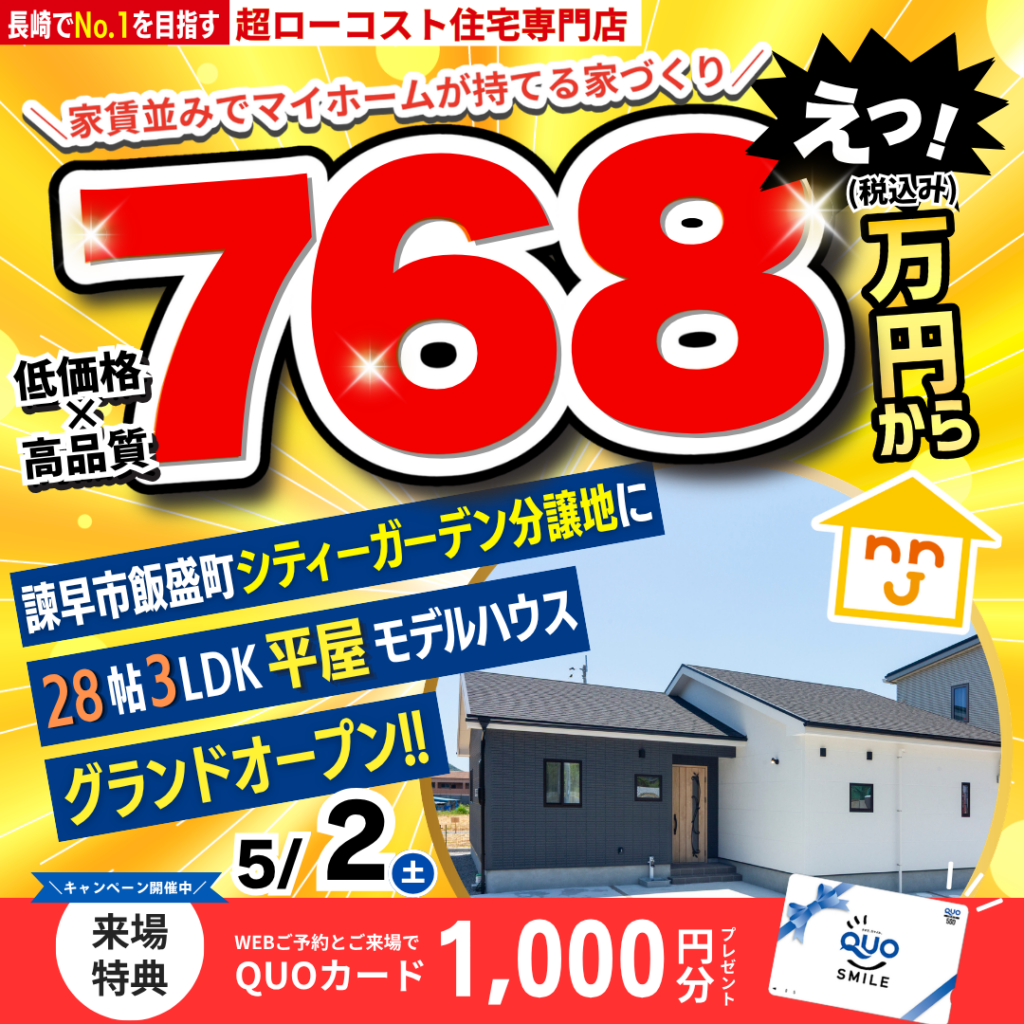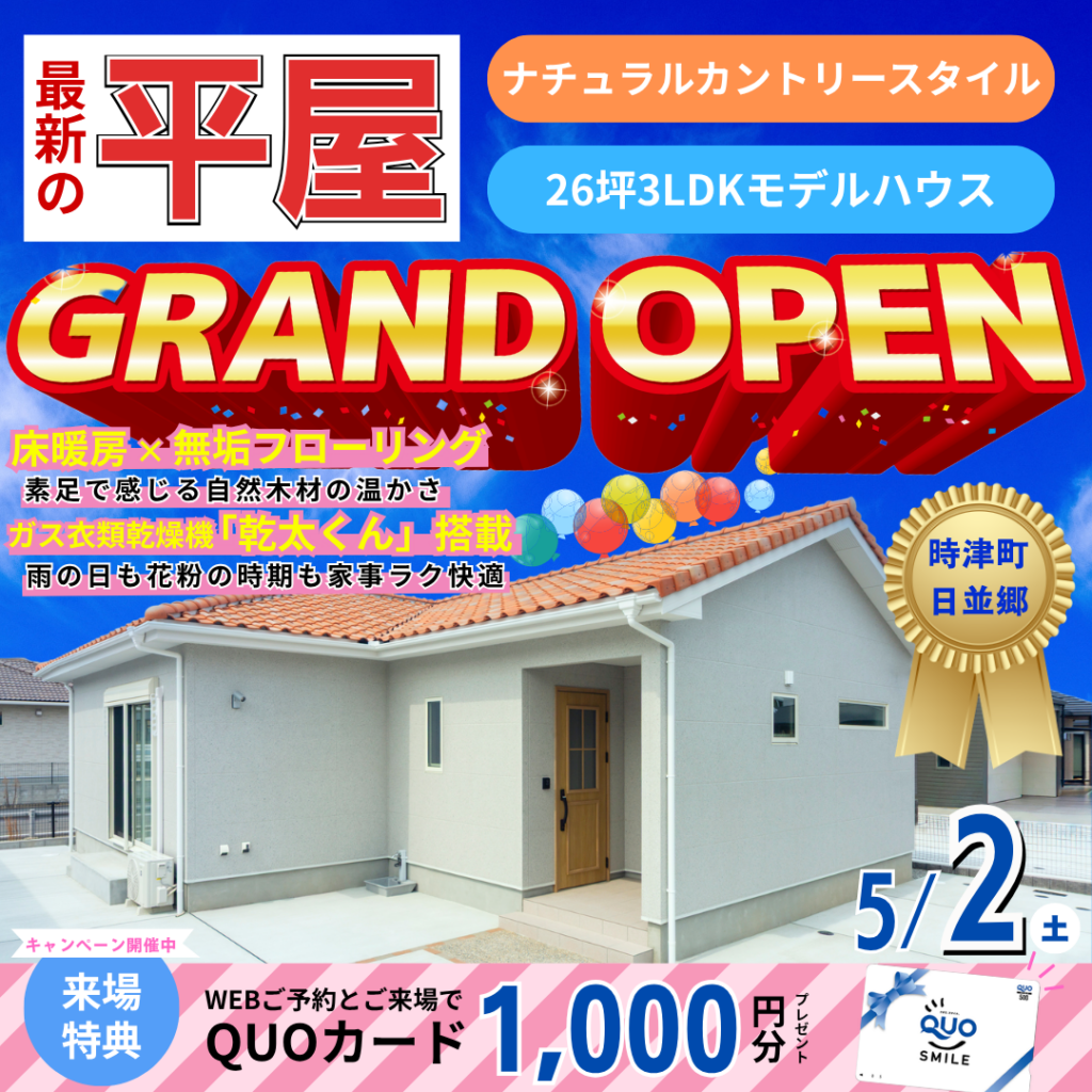 inシーサイドひなみIV4月・5月3月28日(土)時津町日並郷 シーサイドひなみIVにて最新の平屋モデルハウス✨GRANDOPEN✨ 暮らしやすさと心地よさを兼ね備えた人気の平屋モデルハウスがオープンしました。 \ローコスト住宅でここまで出来る/ZEH水準の性能を備え、快適性と省エネ性を両立した住まい!品質・性能も妥協なしのニコニコ住宅を体感できる大チャンス!ぜひご予約おまちしております★ …