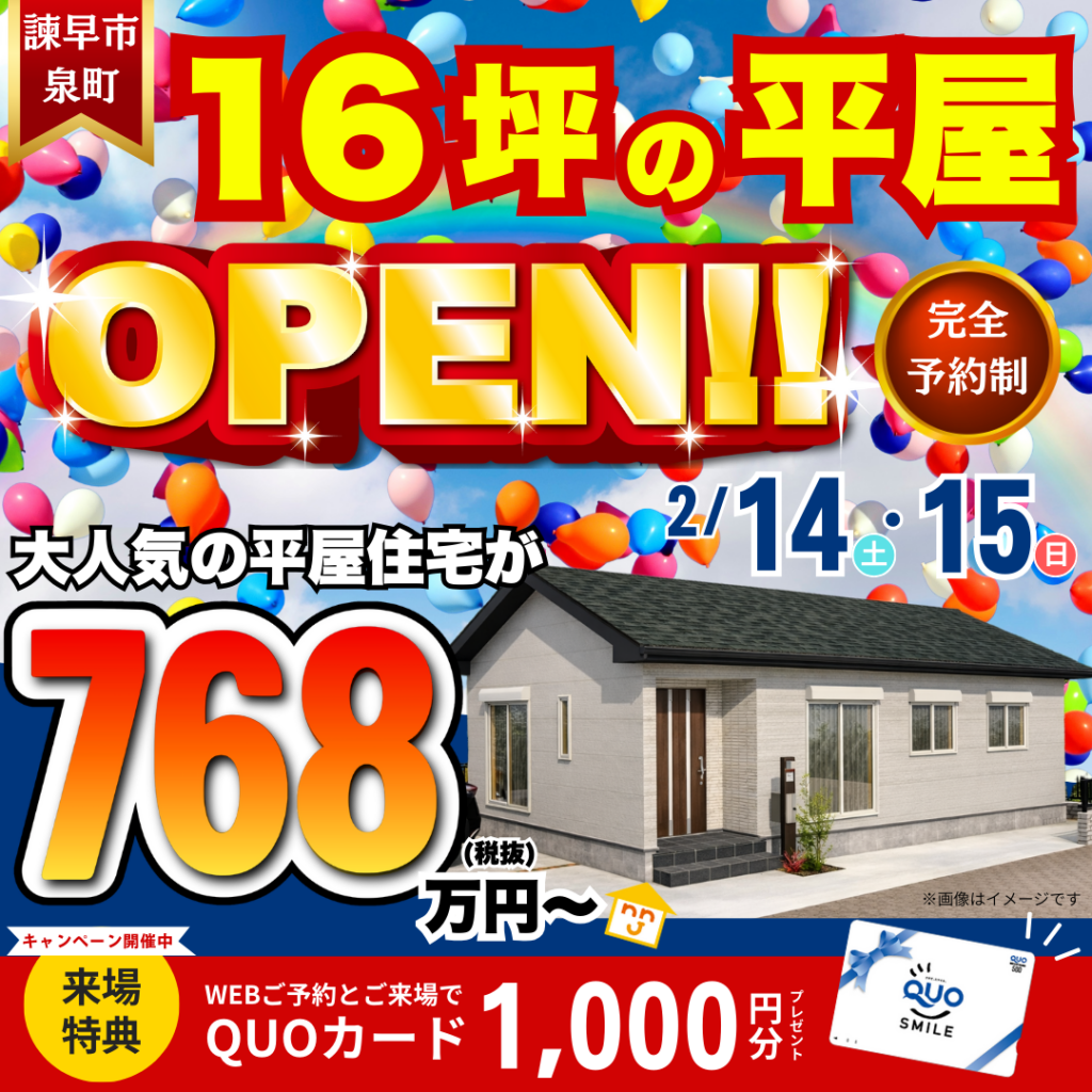 in諫早市泉町~ 今流行りのコンパクト平屋 ~諫早市泉町にGRAND OPEN‼ 「家賃を払い続けるのは、もうもったいないかも…」そのような方におすすめのお家が登場!!16坪・1LDKのコンパクト平屋 間取りや写真だけでは分からない、リアルな広さ・暮らし心地・生活動線をそのまま体感できます! ~完全予約制~こちらのお客様邸は完全予約制となりますので2日前までのご予約をお願…