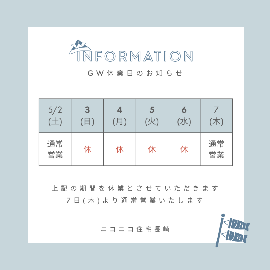 日頃よりニコニコ住宅長崎をご愛顧いただき、ありがとうございます😊誠に勝手ながら、下記の期間を夏季休業とさせていただきます。 2026年5月3日(日)〜5月6日(水) ご不便をおかけいたしますが、何卒ご理解のほどよろしくお願い申し上げます🙇♀️ 5月7日(木)より、通常営業いたします。 期間中のお問い合わせにつきましては、休業明けより順次対応させていただきま…