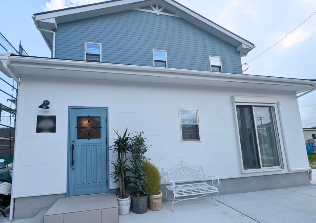 爽やかなブルーが青空に映える北欧風デザインの外観。北欧風の“妻飾り”がかわいらしいアクセントとなり、個性が光る住まいに仕上がりました。