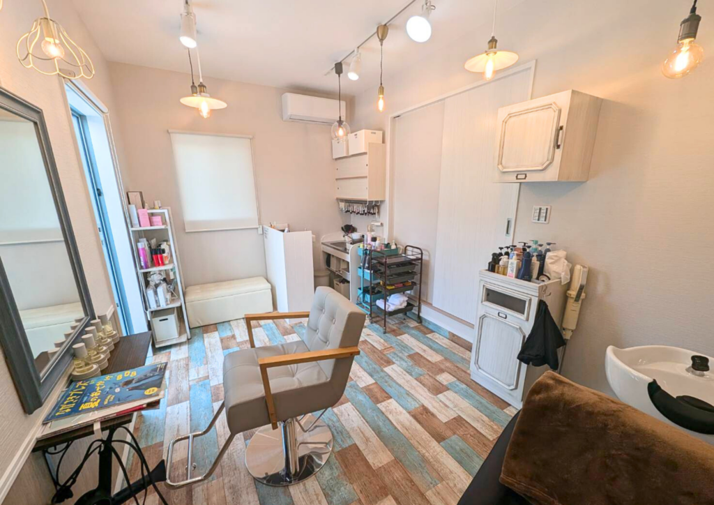 床材には、大胆な水色のペイントが目を引くヴィンテージ調の木目柄を採用。空間に個性とおしゃれな雰囲気をプラスしています。プライベート感のある落ち着いたサロンは、訪れる人がゆったりと過ごせる居心地のよい空間に仕上がりました。
