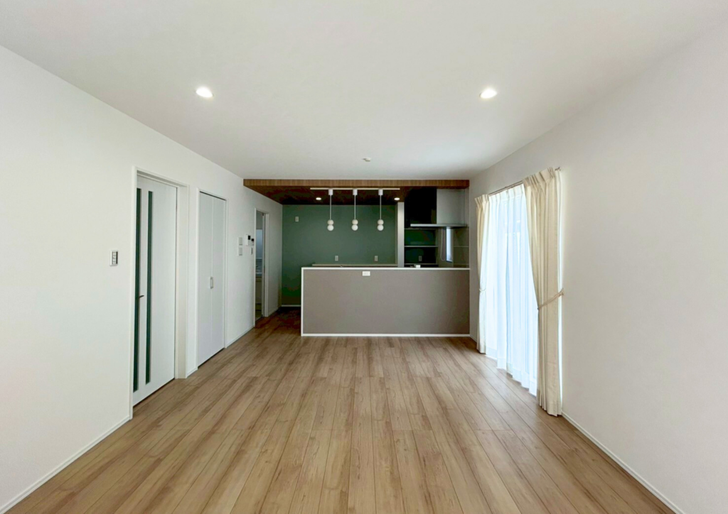 木目の温かみを感じるフローリングと、キッチン背面の落ち着いたアクセントクロスが調和したおしゃれなLDK。ペンダントライトや折り下げ天井が空間のアクセントとなり、デザイン性のある空間に仕上がっています。