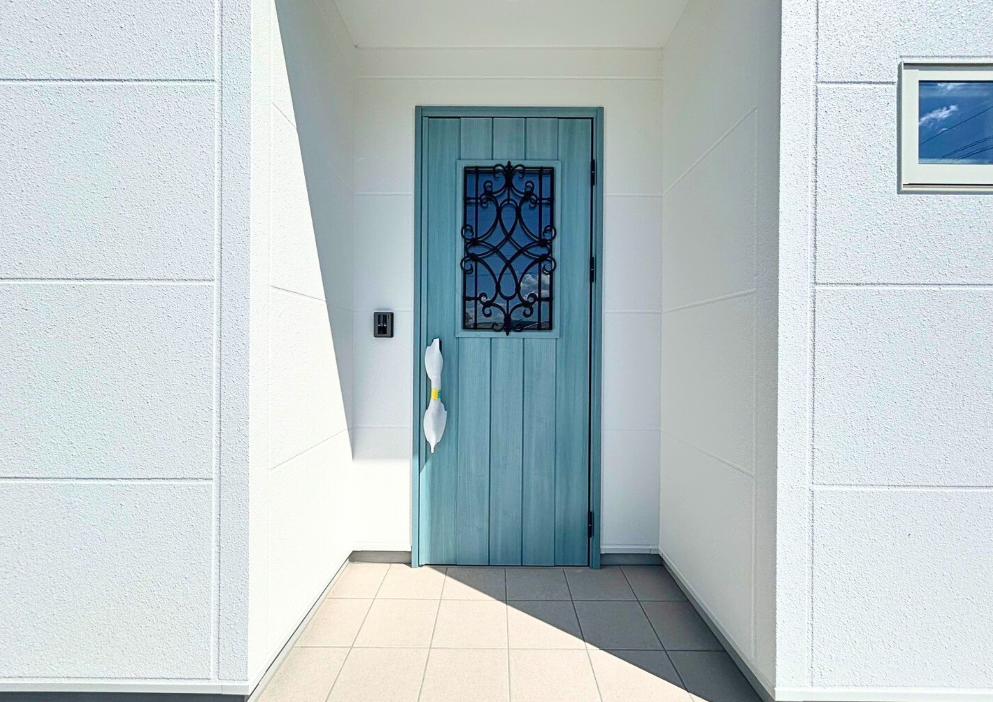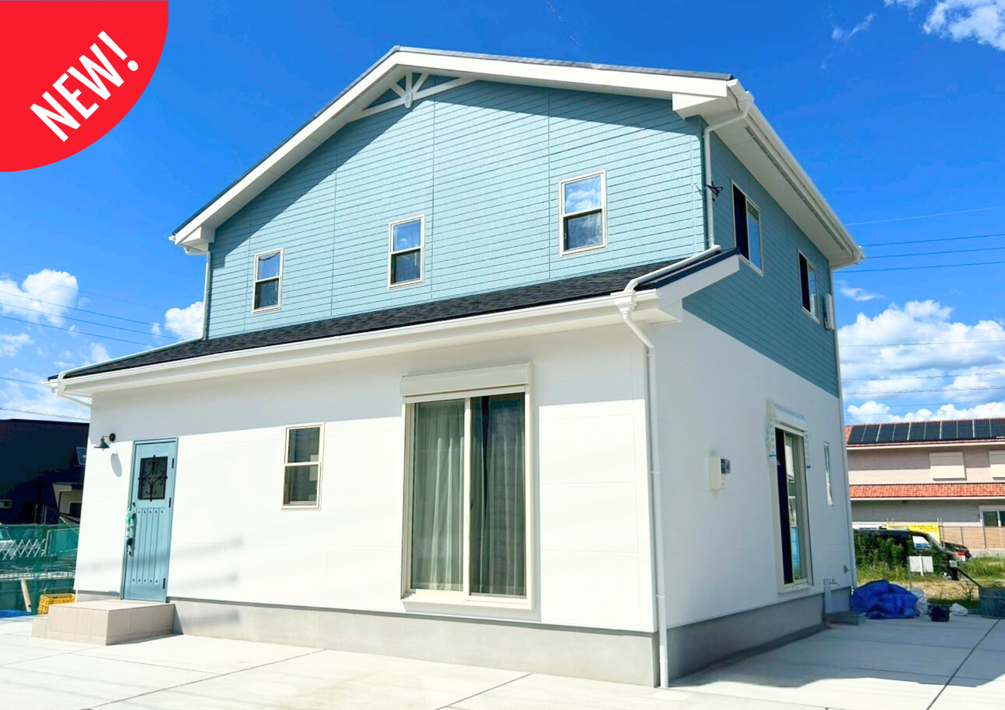 爽やかなブルーが青空に映える北欧風デザインの外観。北欧風の“妻飾り”がかわいらしいアクセントとなり、個性が光る住まいに仕上がりました。