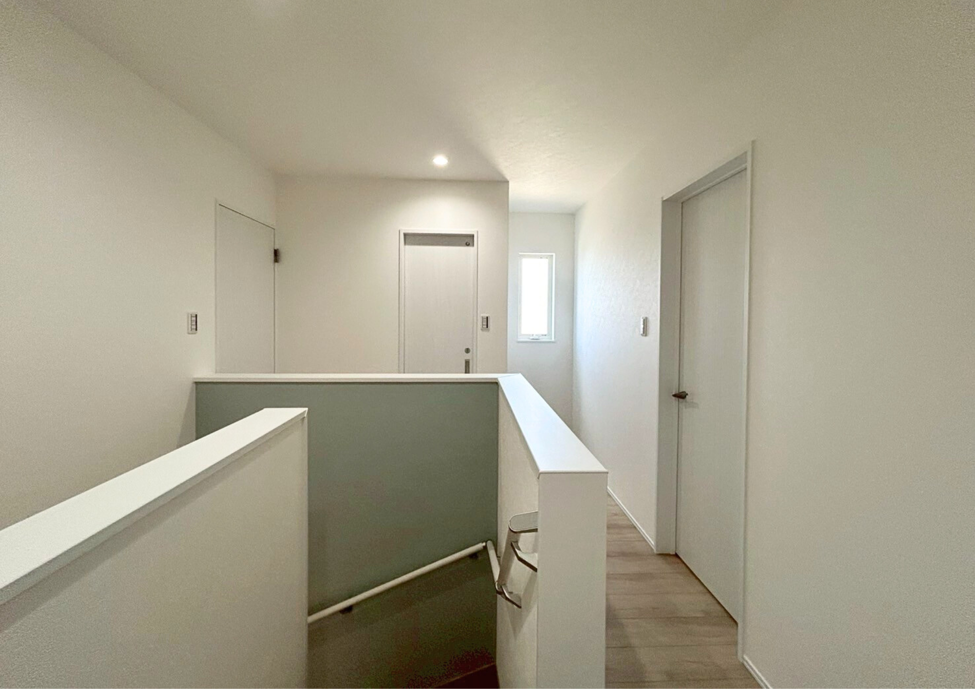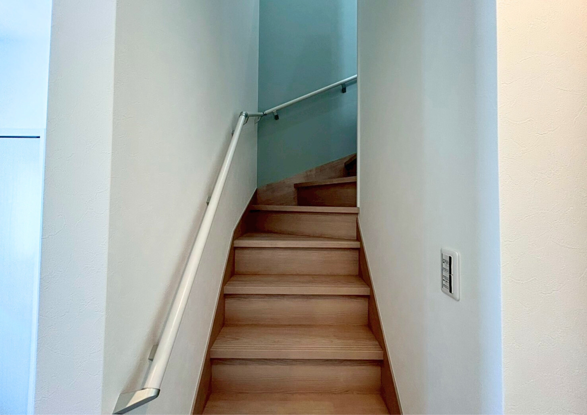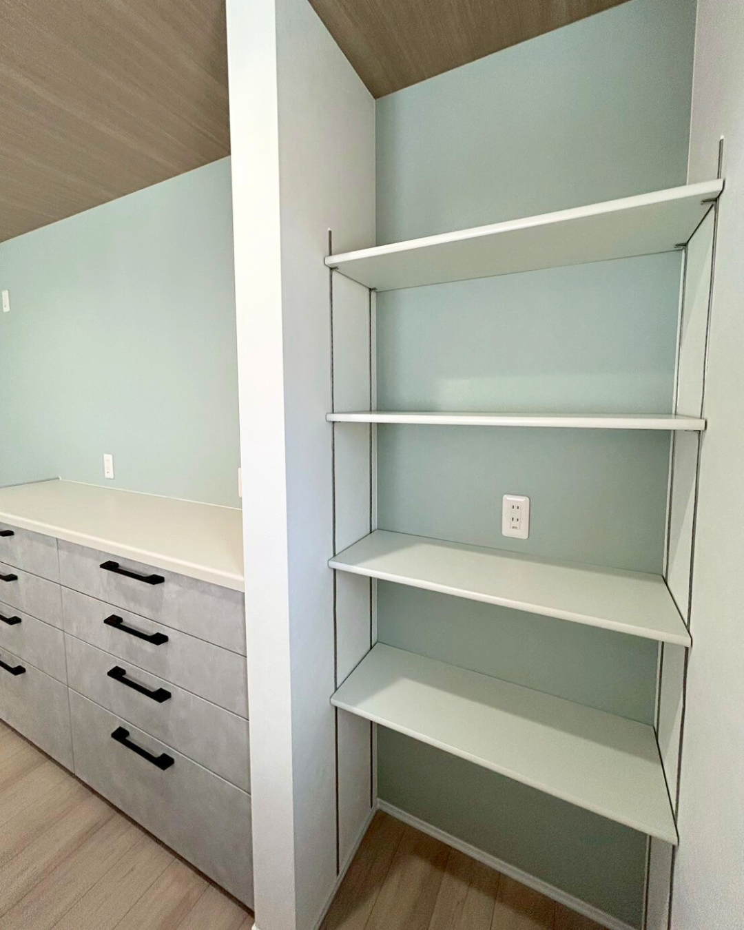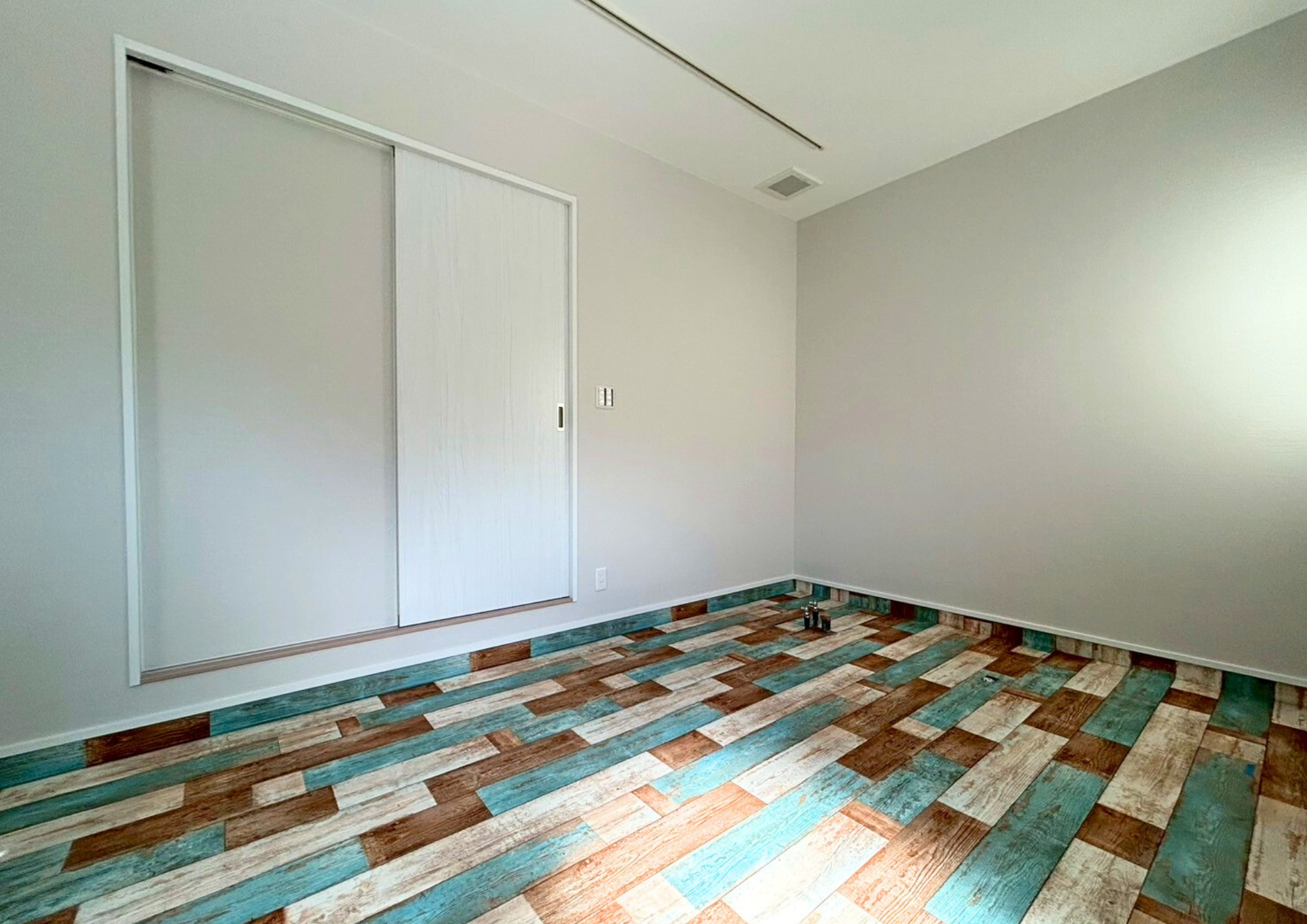 床材には、大胆な水色のペイントが目を引くヴィンテージ調の木目柄を採用。空間に個性とおしゃれな雰囲気をプラスしています。プライベート感のある落ち着いたサロンは、訪れる人がゆったりと過ごせる居心地のよい空間に仕上がりました。