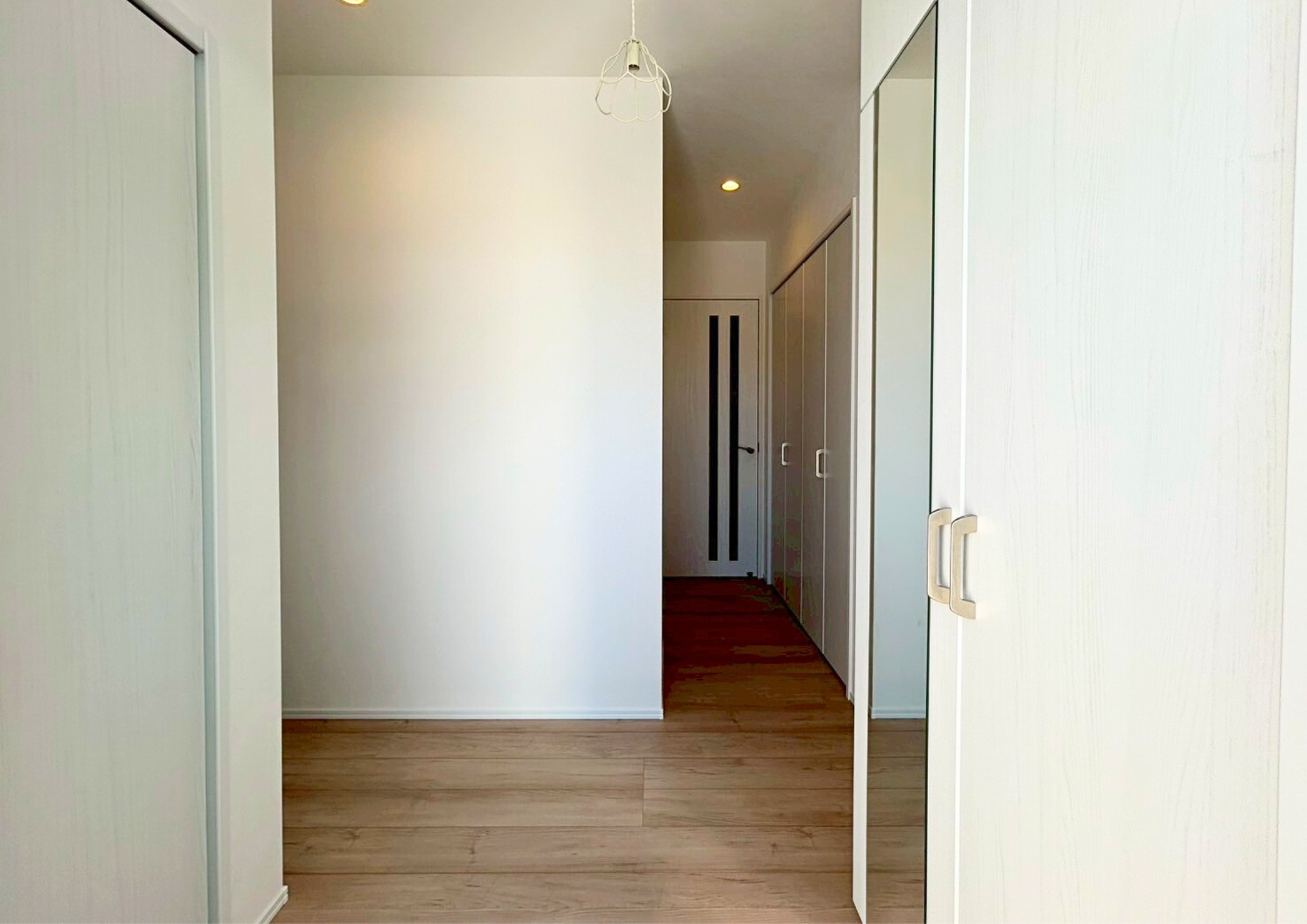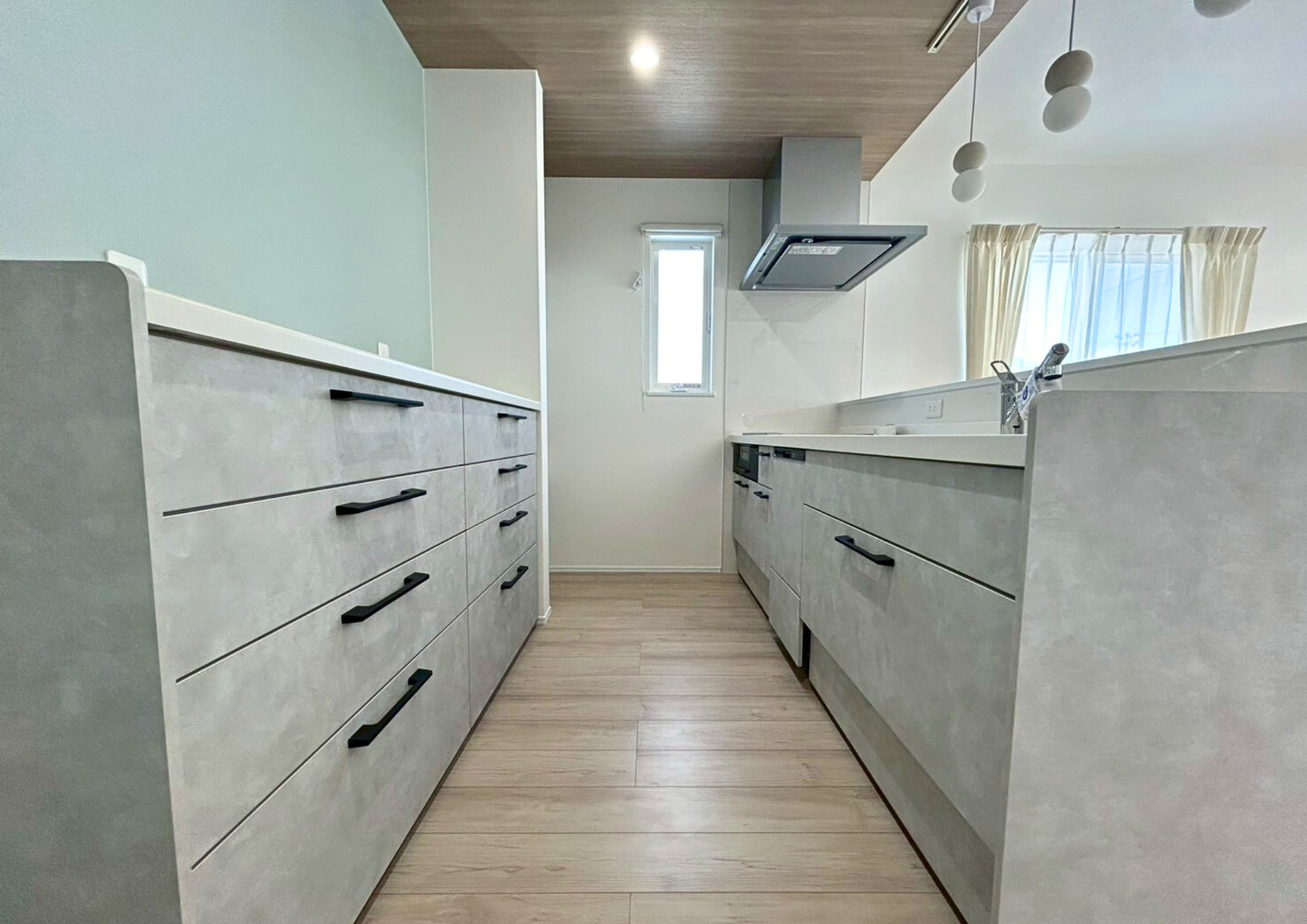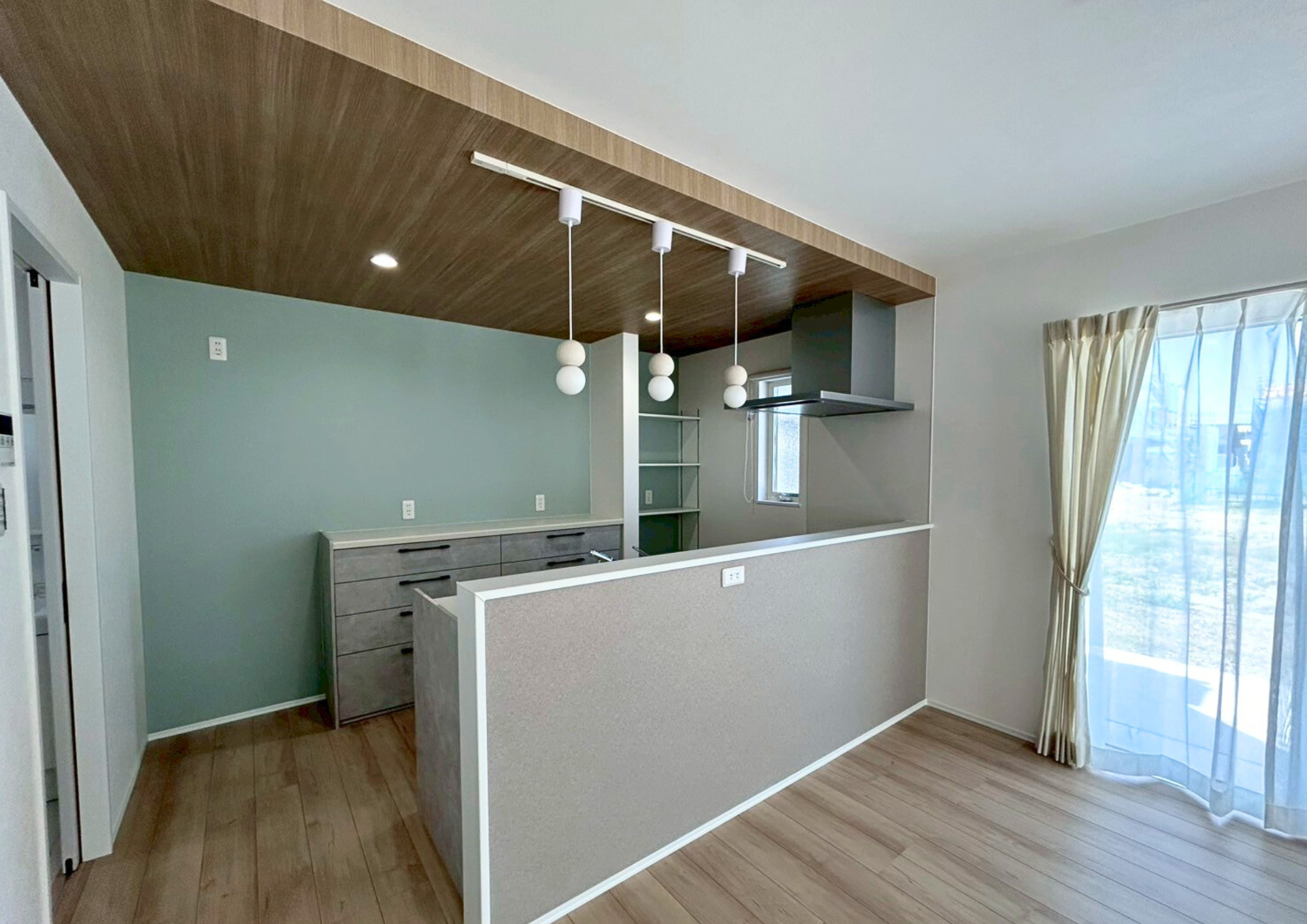 木目の温かみを感じるフローリングと、キッチン背面の落ち着いたアクセントクロスが調和したおしゃれなLDK。ペンダントライトや折り下げ天井が空間のアクセントとなり、デザイン性のある空間に仕上がっています。