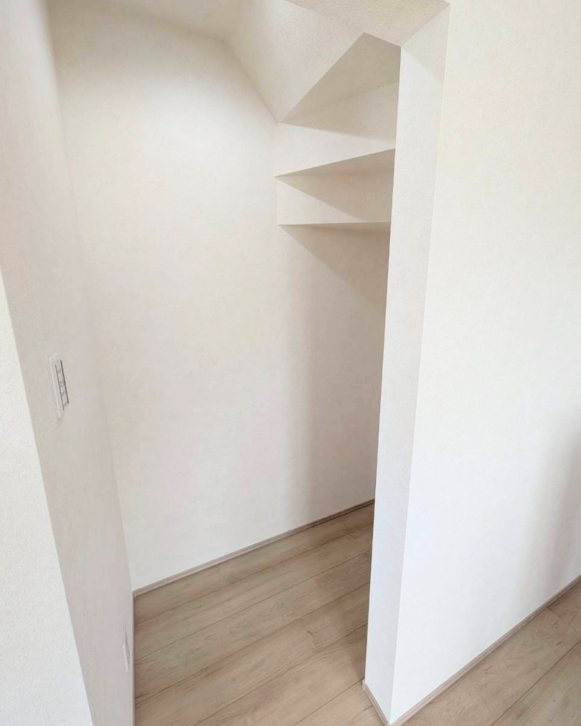 階段下のデッドスペースを有効活用し、食品や日用品をすっきり収納できるパントリーに。見た目はすっきり保ちながら、必要なものをまとめてしまえるスペースです。
